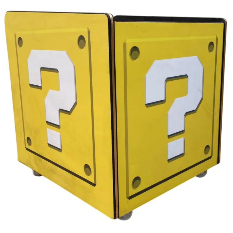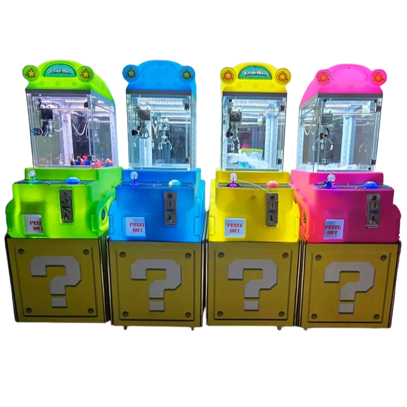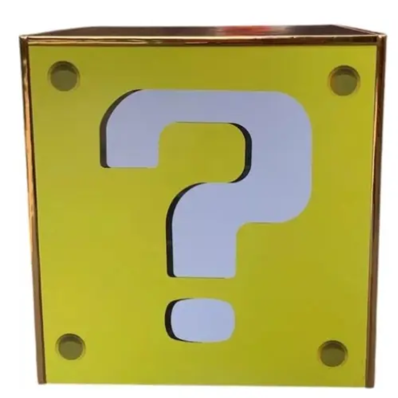 Base decorativa tipo cubo con signo de interrogación para mini garra Tank Elite, ideal para elevar la máquina, hacerla más visible y darle una presentación mucho más llamativa en negocios, eventos y espacios de entretenimiento.