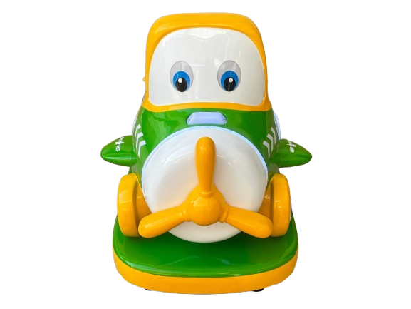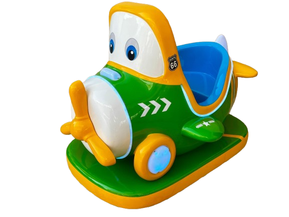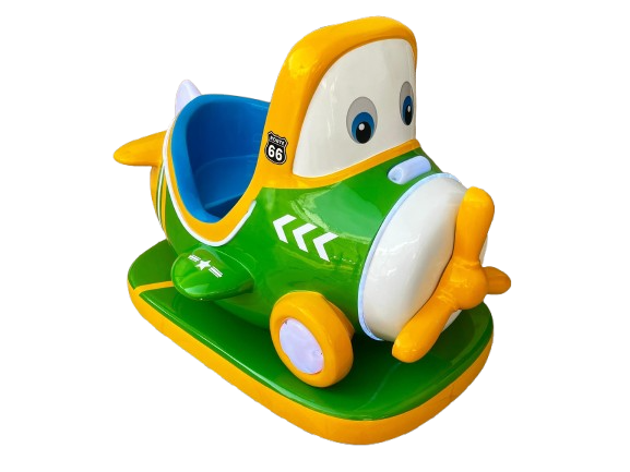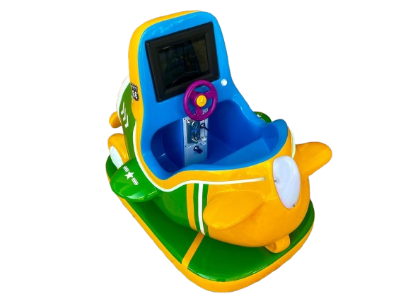 Montable infantil tipo avión, fabricado en fibra de vidrio con base metálica para mayor resistencia. Ideal para negocios, plazas, restaurantes y centros comerciales. Incluye pantalla y volante.