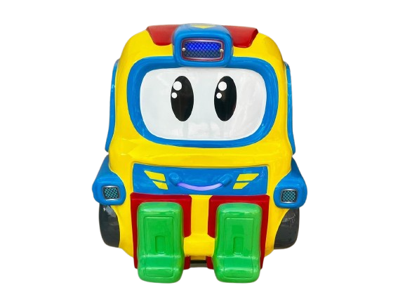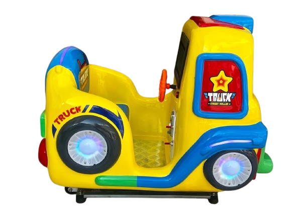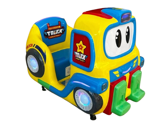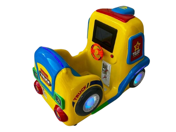 Montable infantil tipo camión, fabricado en fibra de vidrio con base metálica para mayor resistencia. Ideal para negocios, plazas, restaurantes y centros comerciales. Incluye pantalla y volante