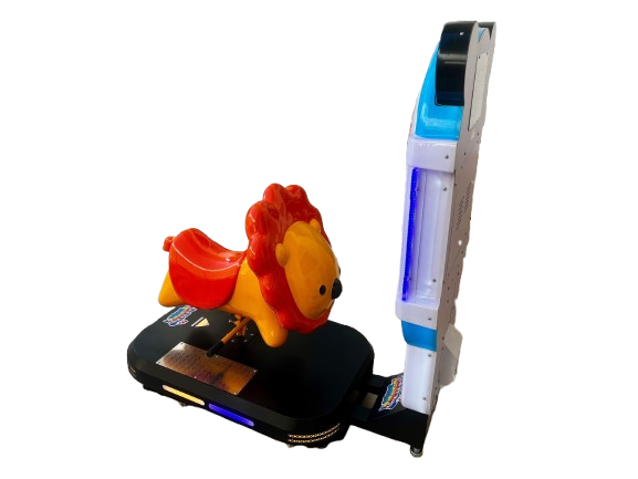 Montable infantil interactivo tipo león con pantalla, ideal para negocios, plazas, restaurantes y centros comerciales. Su figura de león en plástico y su diseño visual llamativo lo convierten en una excelente opción para atraer la atención de los niños