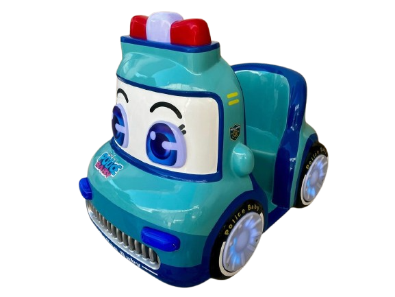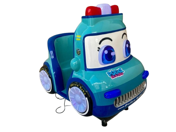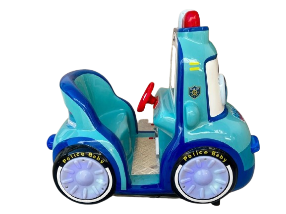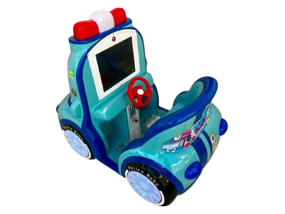 Montable infantil tipo patrulla azul, ideal para negocios, plazas, restaurantes y centros de entretenimiento. Está fabricado en fibra de vidrio con base metálica para mayor resistencia, e incluye pantalla y volante para una experiencia más atractiva e interactiva para los niños.